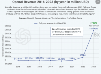 OpenAI has surpassed the $1 billion revenue mark for the first time in 2023, reaching a staggering $1.6 billion, according to data obtained by Finbold. This achievement reflects a phenomenal year-over-year (YoY) increase of 700%, soaring from $200 million in 2022. This financial milestone highlights the company’s resilience, despite recent leadership crises.
