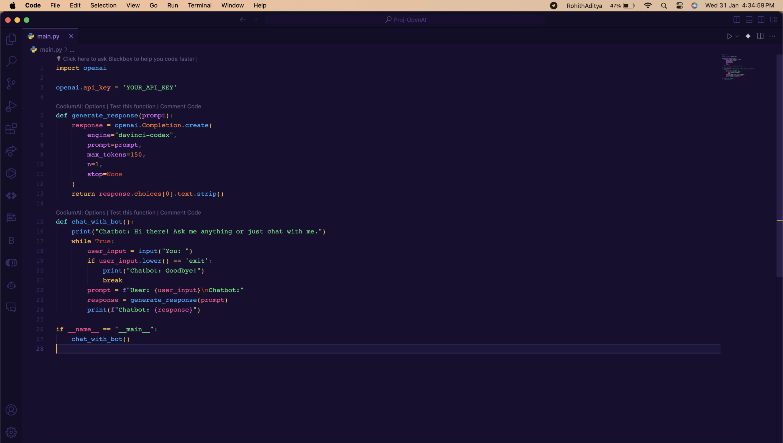 Once we are done with this, it’s time to collect user input as a prompt and conclude with output. To achieve this, we will declare another function called ‘chat_with_bot()’ and work with a while loop to make the condition work in a loop, once the result is shared with the user. To do that, we declare a loop with the syntax of ‘while True:’ and inside the ‘chat_with_bot()’ function is a Python function that implements a simple chatbot. It takes user input, generates a response using the OpenAI Codex API, and prints the response to the console. The chatbot continues to interact with the user until the user enters ‘exit’.