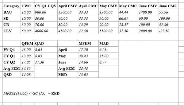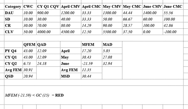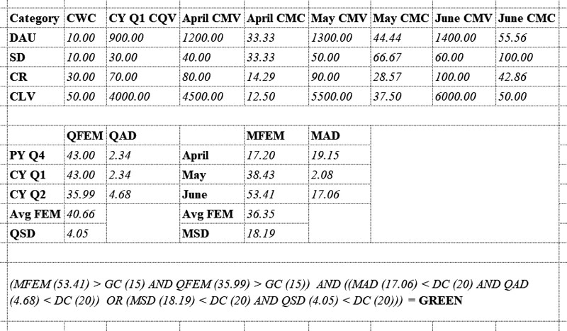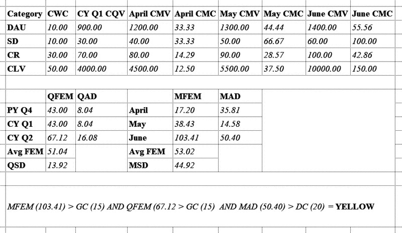 - Quarterly FEM (QFEM): The quarterly FEM is a broader evaluation metric that is calculated at the end of every quarter. It offers a more extensive perspective on the feature’s effectiveness by considering the monthly FEM values over the three months of a quarter (M1 MFEM, M2 MFEM, and M3 MFEM). The QFEM is derived by summing these monthly FEM values and then dividing the result by three to calculate the quarterly average. For example, if you want to assess the feature’s performance over an entire quarter, QFEM provides a summary value based on the changes observed in the monthly FEM values. This quarterly measure is especially useful for longer-term performance evaluation.