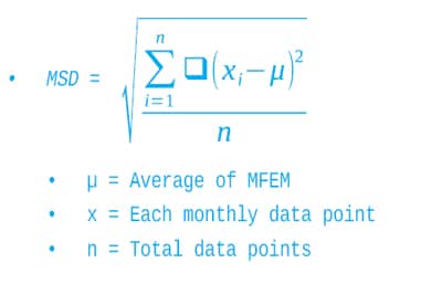 - Monthly standard deviation (MSD): This denotes a variation of the feature standard deviation specifically calculated at the end of every month. It quantifies the amount of variation or fluctuation in the monthly feature effectiveness measure (MFEM) values over a series of months. MSD offers insights into how consistent or variable the feature’s effectiveness has been monthly. To calculate MSD, the formula involves finding the square root of the sum of squared differences between each monthly MFEM data point (x) and the average of the monthly MFEM values (µ). This value is then divided by the total number of data points (n) to obtain the monthly standard deviation.