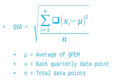 - Quarterly standard deviation (QSD): This is designed to measure the variation in the FEM over a broader timeframe, specifically at the end of every quarter. It provides a more comprehensive perspective on the feature’s stability or variability by considering the monthly FEM values over the three months of a quarter. The formula for calculating QSD is akin to MSD, involving the square root of the sum of squared differences between each quarterly FEM data point (x) and the average of the quarterly FEM values (µ). The result is divided by the total number of data points (n) to obtain the quarterly standard deviation.