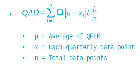 - Quarterly absolute deviation (QAD): This is designed to measure the variation in the FEM over a broader timeframe, specifically at the end of every quarter. It provides a more comprehensive perspective on the feature’s stability or variability by considering the quarterly FEM values over the three months of a quarter. The formula for calculating QAD is similar to MAD, involving the absolute difference between each quarterly FEM data point (x) and the average of the quarterly FEM values (µ). The absolute differences are summed and divided by the total number of data points (n) to obtain the quarterly absolute deviation.
