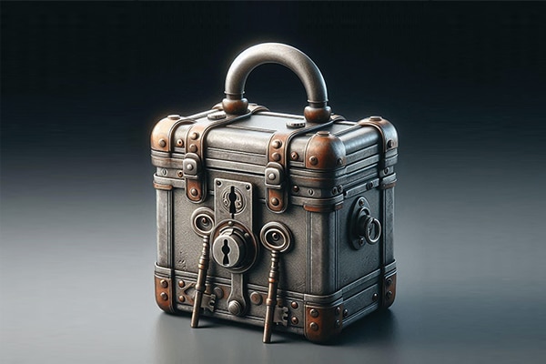Once upon a time there was a town where people traded very valuable items. But the town had notorious thieves that kept stealing these items. So the people built a special lockbox and kept the items in them for trading. This was a strong box and could not be broken or destroyed to get the contents inside it. The only way to do that was by unlocking it. The box had two keyholes and did not have any fixed keys. A locksmith could make special keys for the box in pairs — if one of the keys in the pair was used to lock the box, only the second key in the same pair could unlock it.