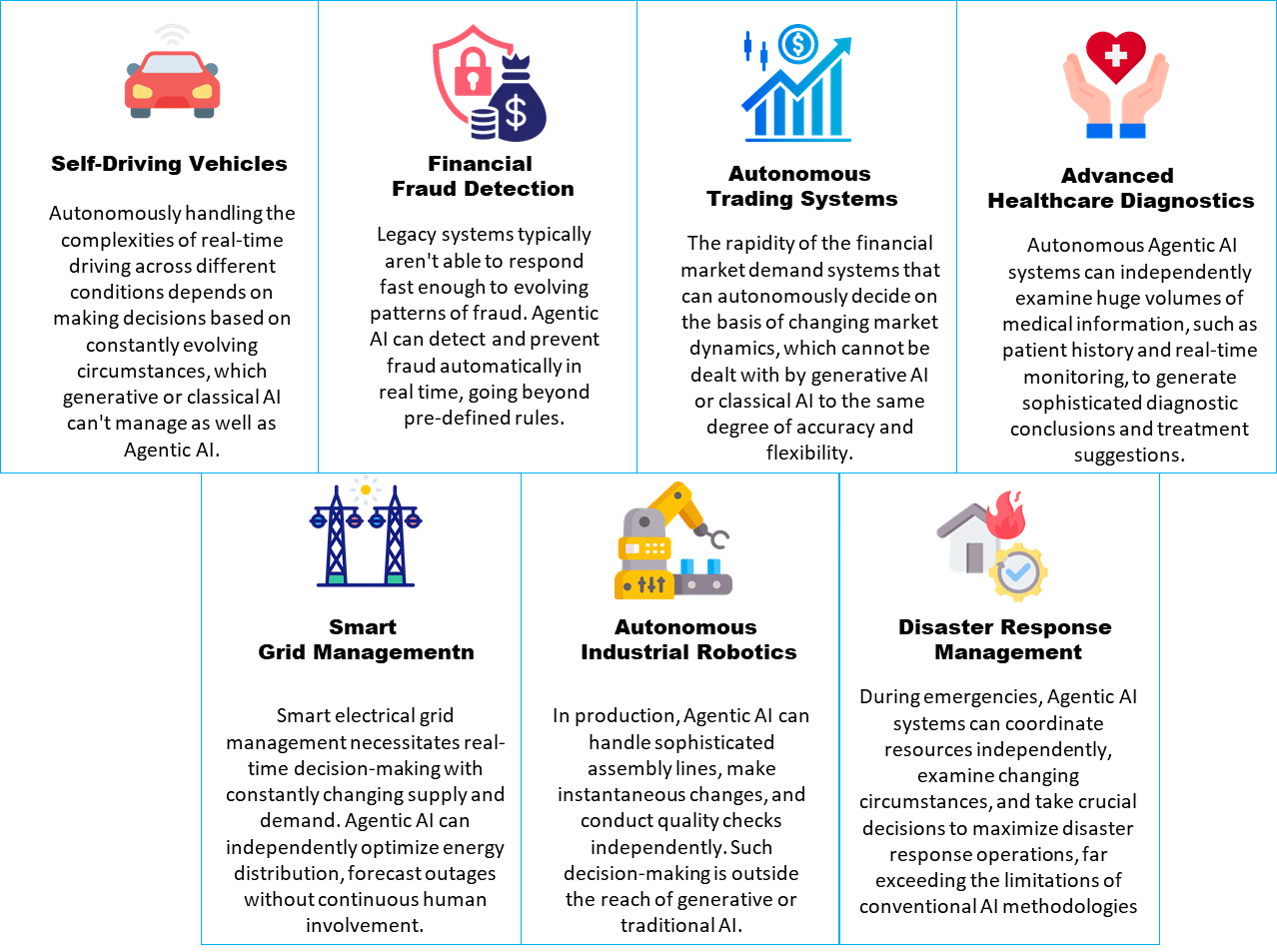 Agentic AI is revolutionary because it can operate within uncertainty and complexity. Unlike current AI, which requires clearly coded rules or tightly constrained environments, Agentic AI can operate in a wider variety of situations, analyse the risks involved, and pick the action that maximises the desired state. For instance, in the case of an autonomous vehicle, an agentic AI system can make split-second decisions under real-time conditions and thus reduce the necessity of human intervention. In industrial automation, the agentic AI system keeps track of processes in real time and refines them to attain peak performance, while foretelling the maintenance needs. These self-abilities enable agentic AI to address challenging problems.