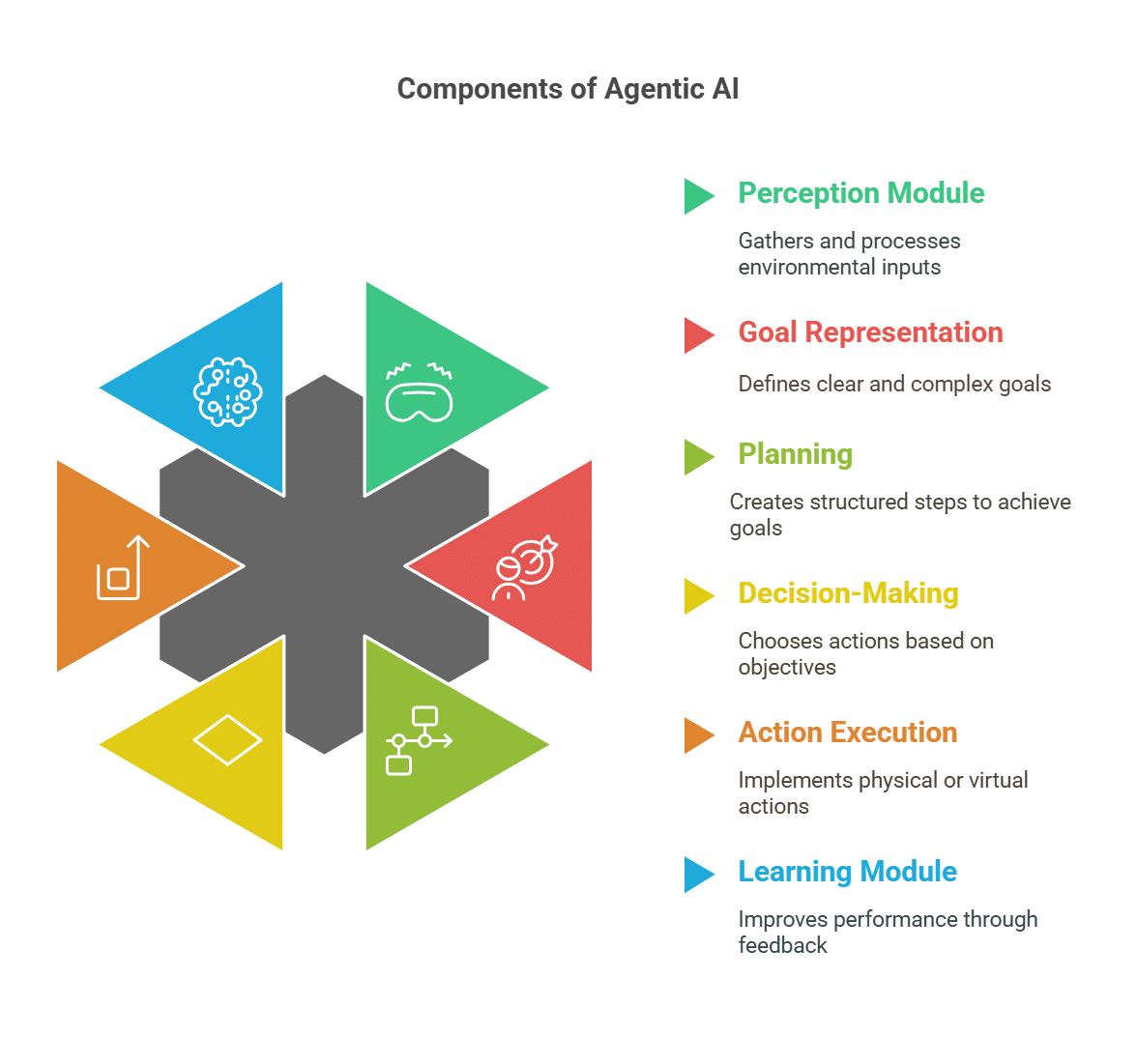 Agentic AI systems are made up of several modules that work together to generate intelligent and adaptive behaviour. Each module deals with a specific task but is related to the others, thus allowing the system to perceive its world, process information, make decisions, and respond in an appropriate manner. Let’s look at each of these components in detail for better understanding.