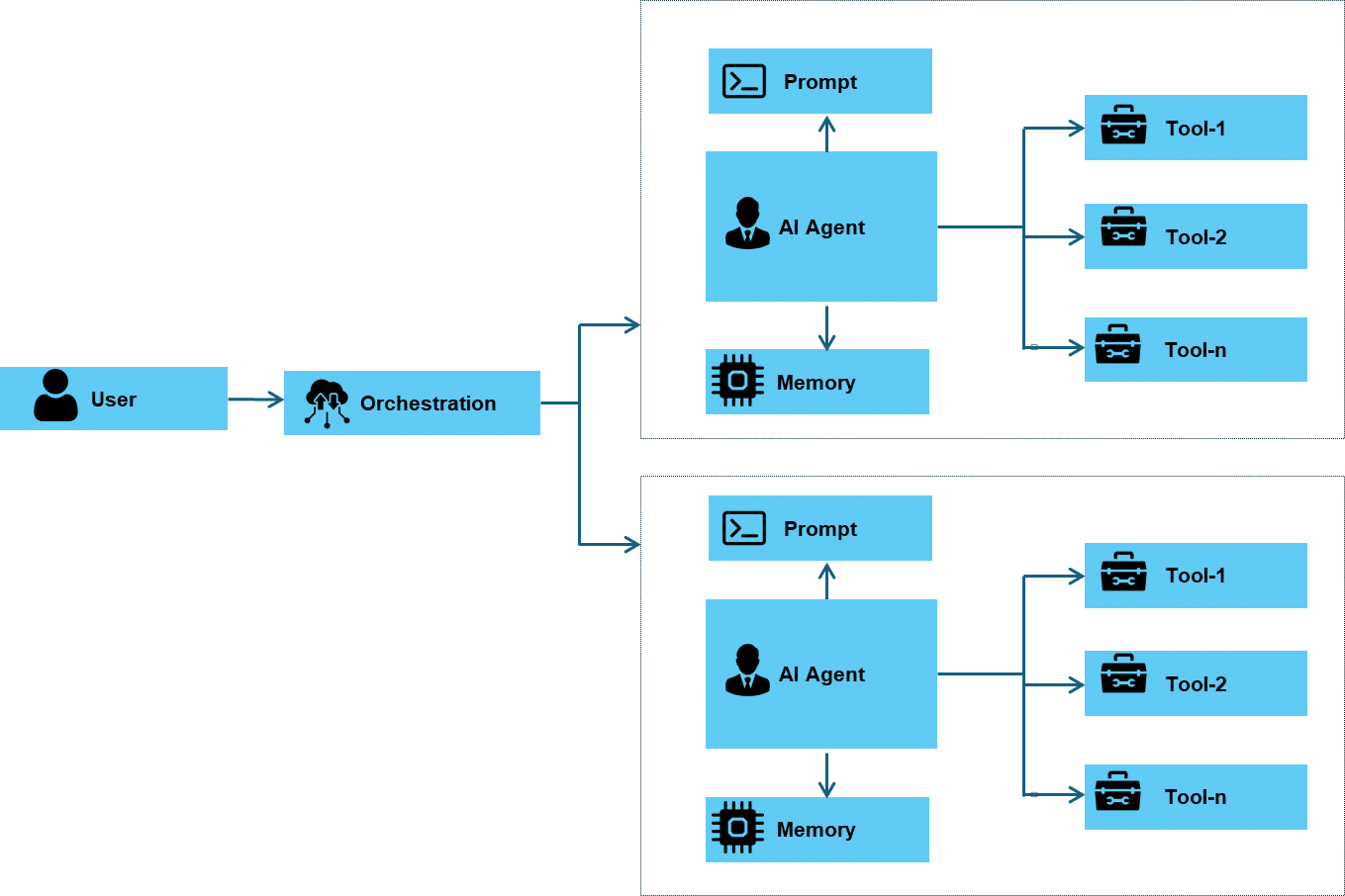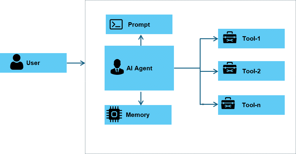 In a single-agent system, the architecture is focused on one AI agent that uses a set of tools to address some problems. This includes perception, reasoning, action, and learning, as described earlier.