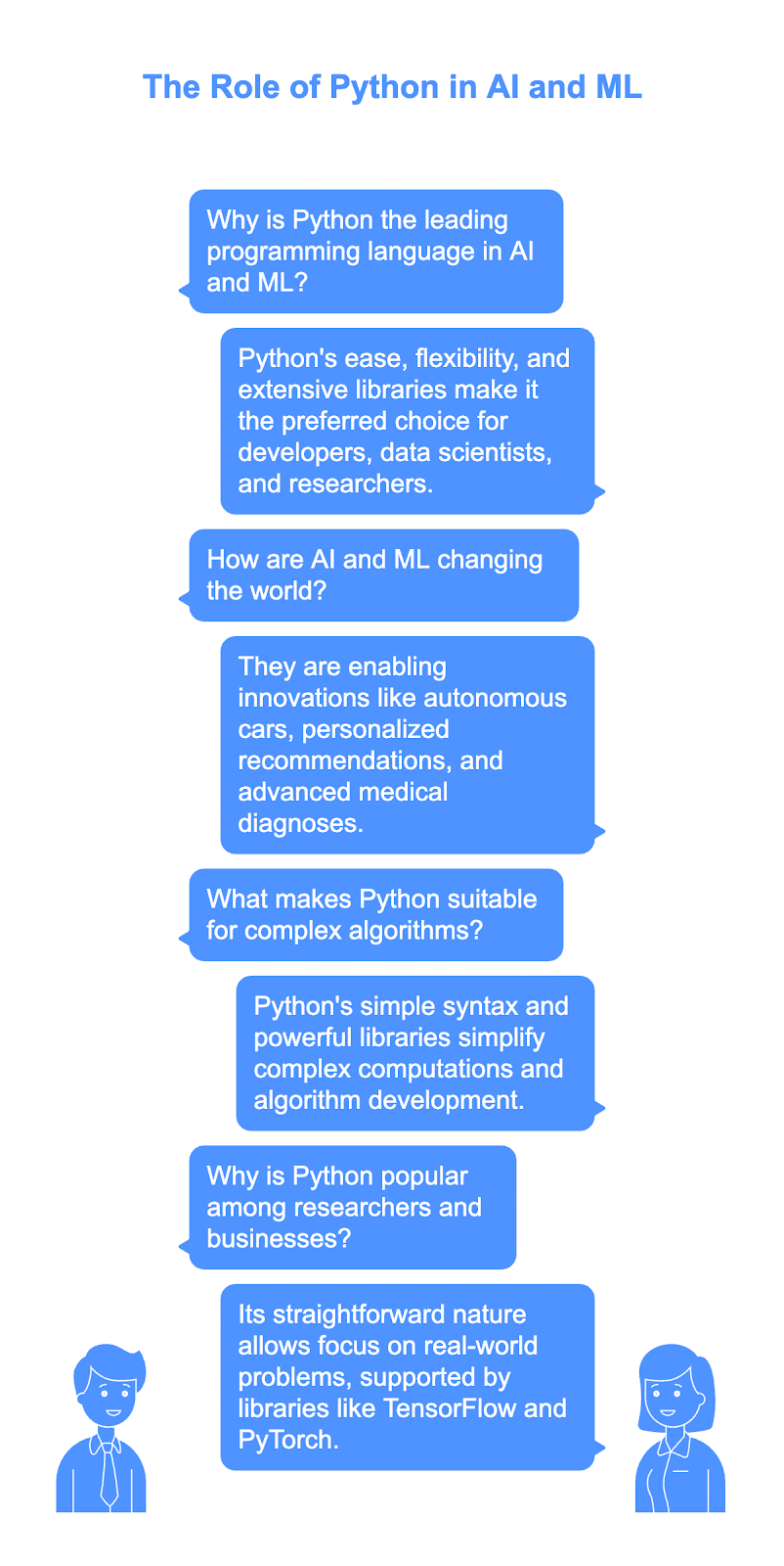 Python’s evolution as the leading language for AI and ML is not accidental. There are several factors behind its popularity among programmers, researchers, and entities that work with AI and ML technologies.
