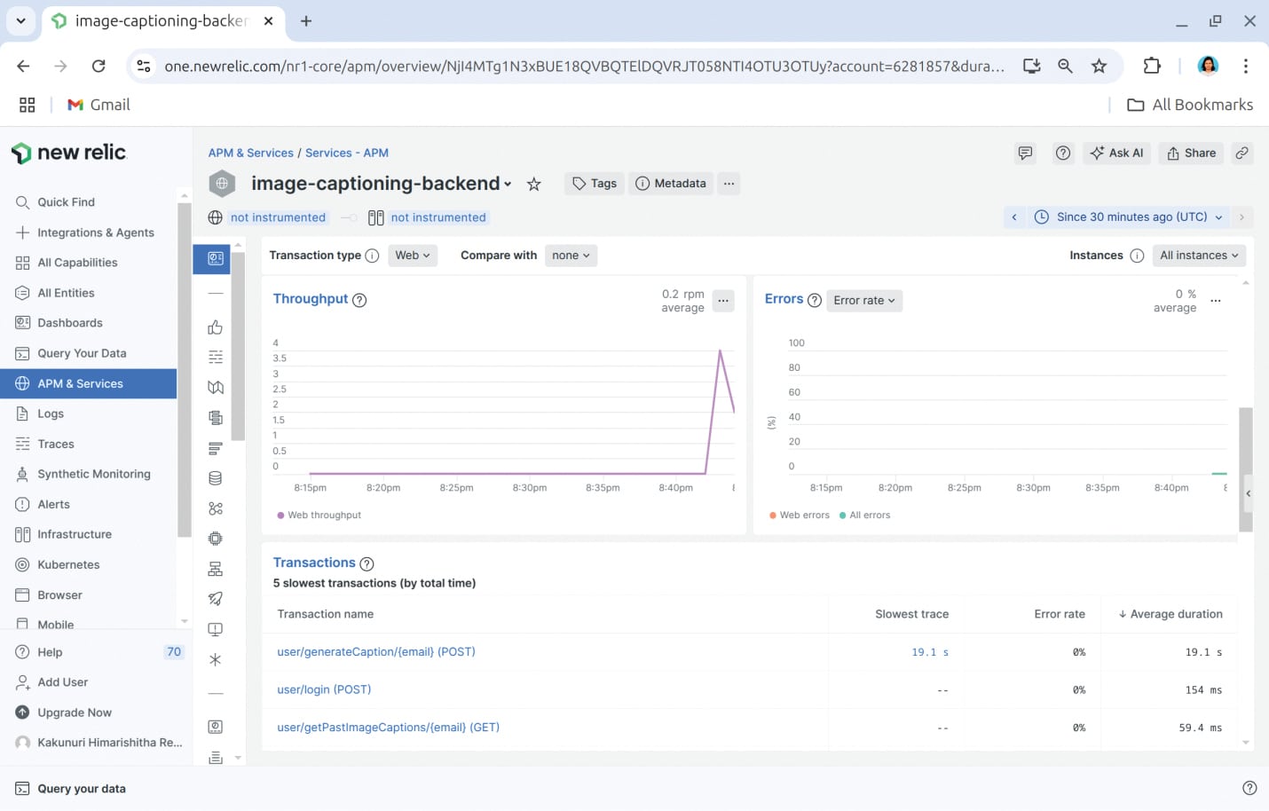 Once the backend container is successfully integrated with New Relic, the dashboard provides valuable insights such as: