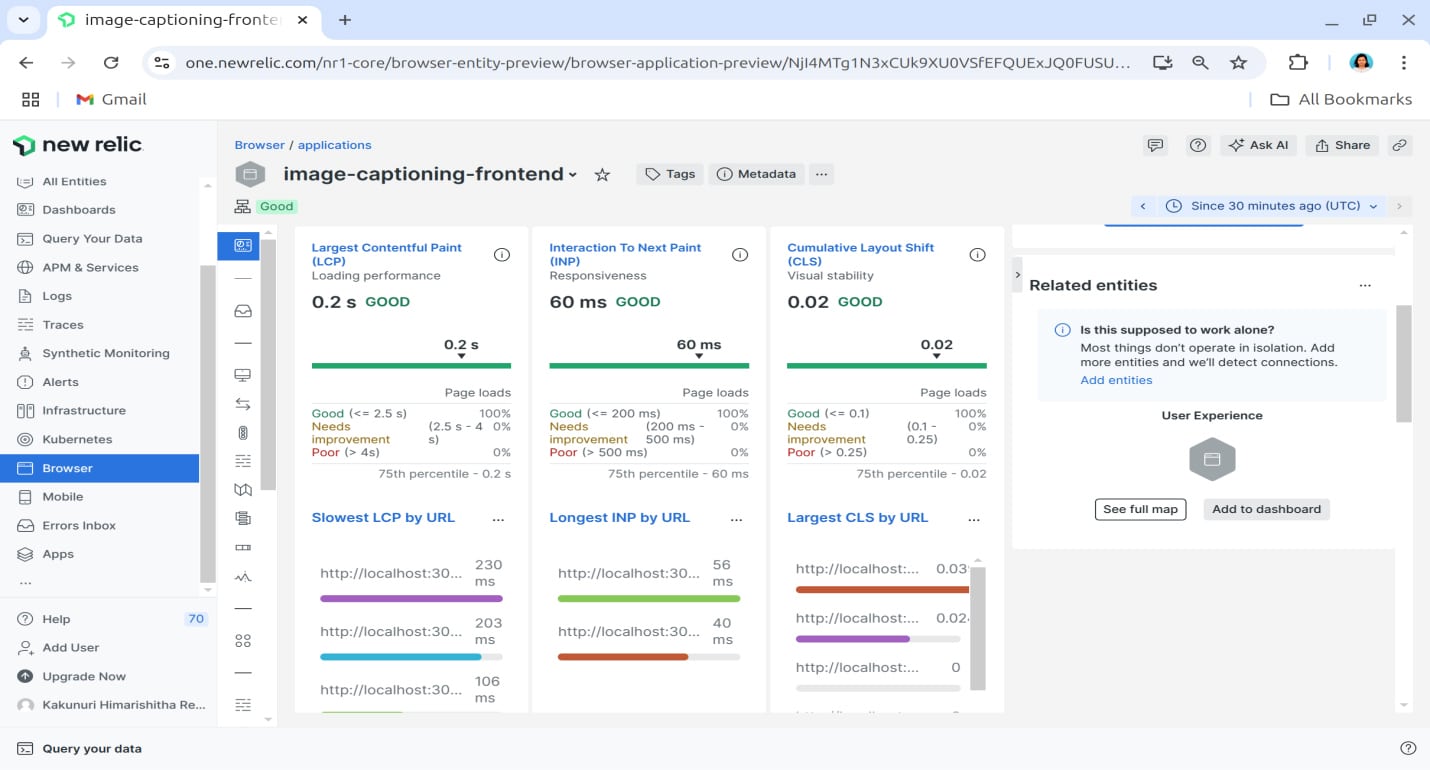 Navigate to the New Relic browser monitoring section and verify that the frontend application appears in the dashboard as shown in Figures 4 and 5.