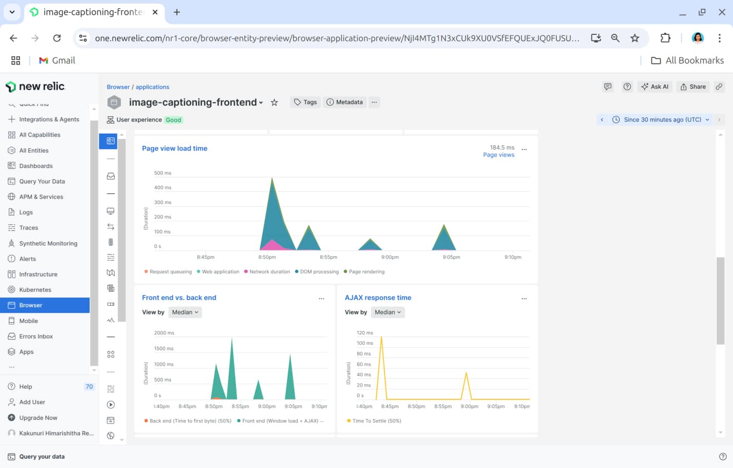 Figure 5: New Relic browser monitoring dashboard displaying frontend performance metrics, including page load time, frontend vs backend response times, and AJAX request performance