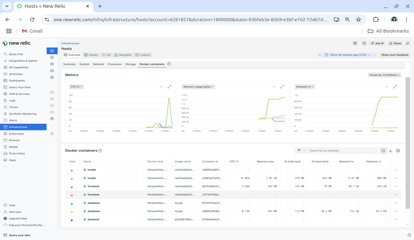 Figure 6: New Relic dashboard showing detailed container-level metrics, including CPU usage, memory consumption, and network activity