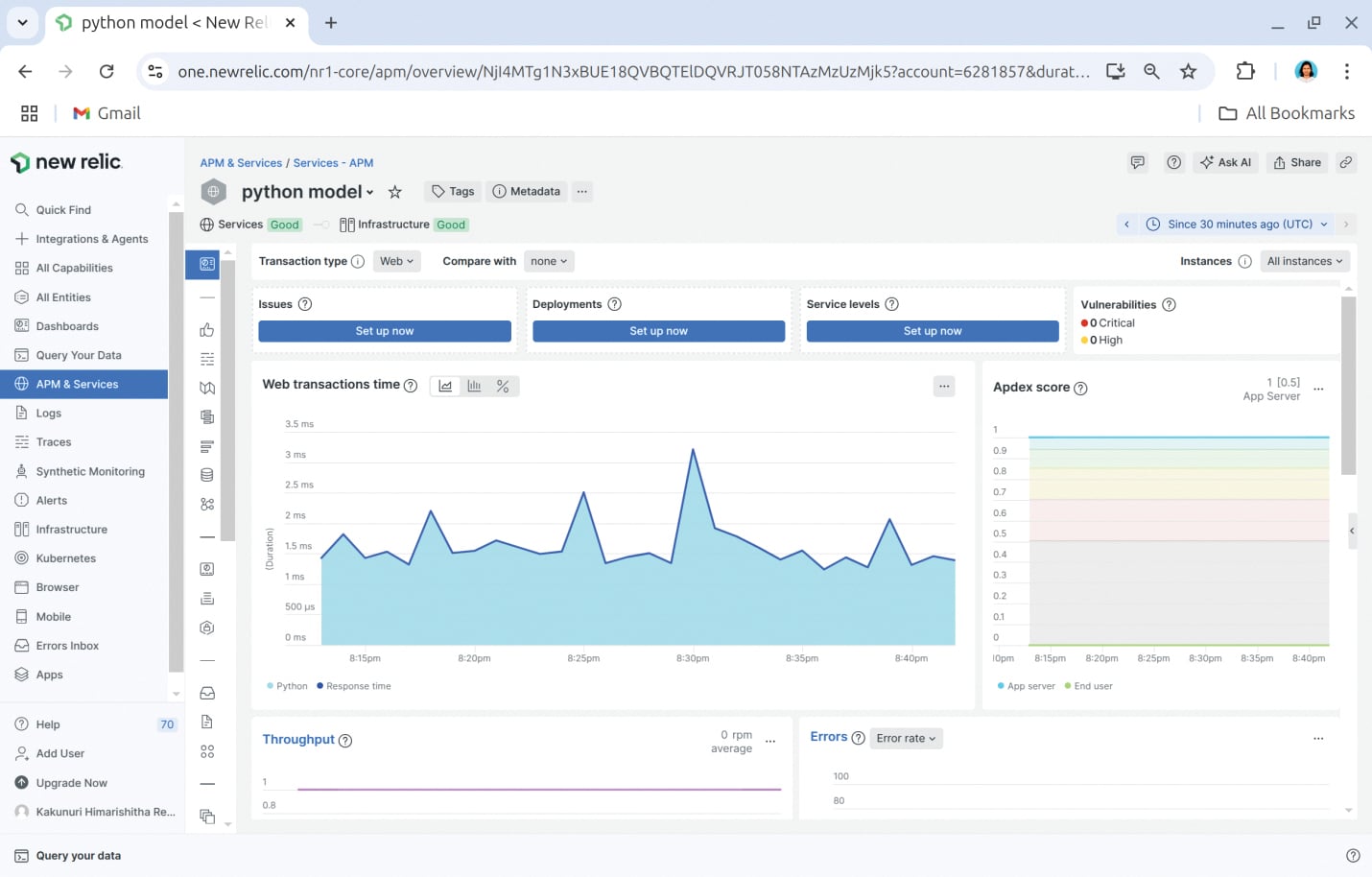 Figure 3: New Relic dashboard displaying key Python application performance metrics, including response times, throughput, and error rates