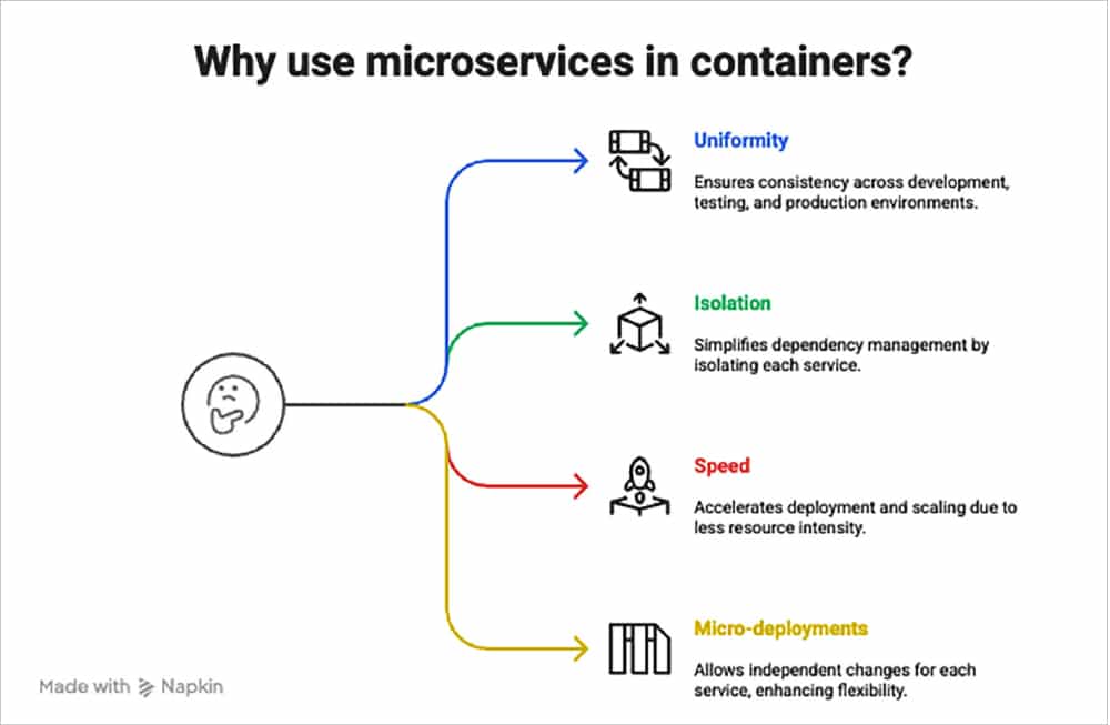 Each microservice runs in its own container, reducing conflicts and improving security.