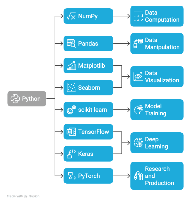 A prime reason why Python is an unrivalled choice for machine learning is the powerful set of libraries associated with it. These libraries abstract complex mathematical operations into simple APIs for building, training, and deploying models.