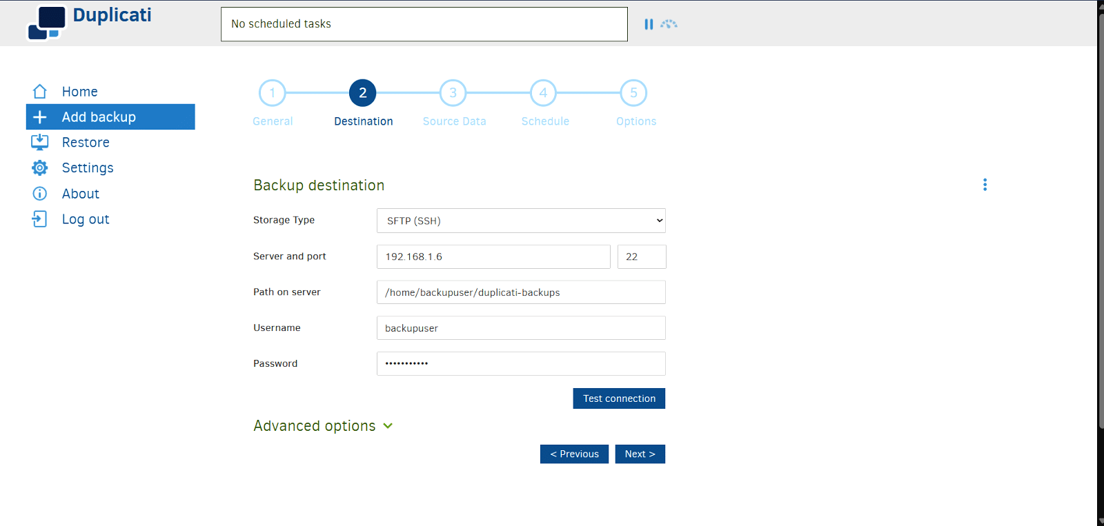 In this step, you will specify where the backup will be stored. For this setup, the destination is the Ubuntu virtual machine configured earlier. Set the storage type to SFTP (SSH), then enter the IP address of the Ubuntu machine, such as 192.168.1.6. Use the default port 22 and provide the path on the server as /home/backupuser/duplicati-backups. Enter the username as ‘backupuser’ and enter the corresponding password that was set for this account on the Ubuntu system. Click on Test connection to make sure Duplicati can reach the server. If successful, click on Next to proceed to the source folder selection.