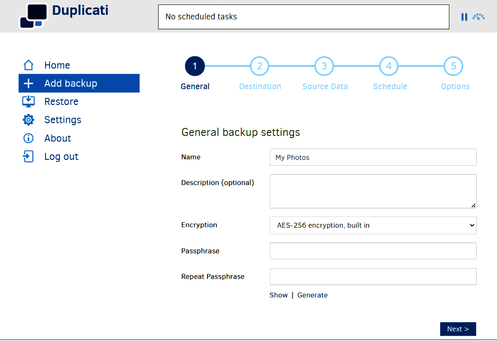 To begin creating your backup job, click on Add backup from the left menu, choose Configure a new backup and click on Next. In this step, you define the basic details of your backup job. Start by giving it a friendly name, such as ‘SOHO Backup’, and optionally add a description with any notes you find useful. For security, choose the built-in AES-256 encryption and set a strong passphrase to protect your backup data. This passphrase is required if you ever need to restore your files, so be sure to keep it safe and secure. Once all fields are filled, click Next to proceed.