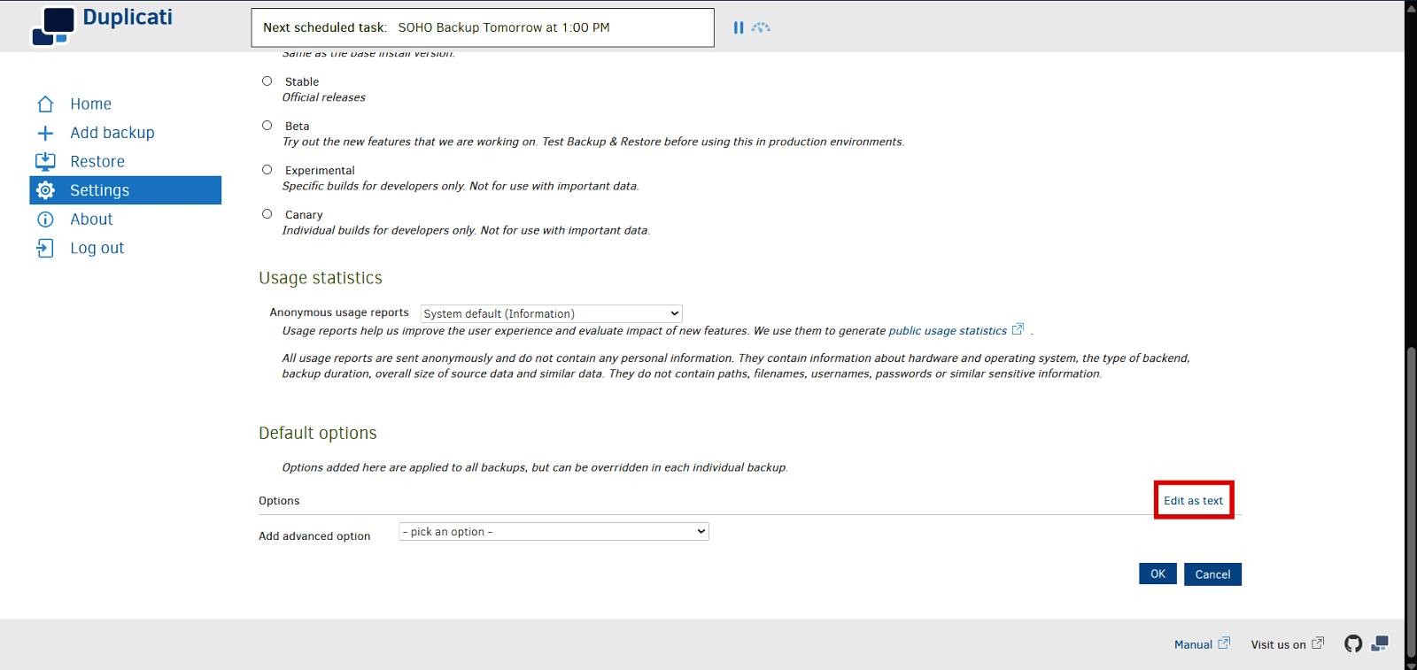 Open global settings: Open the Duplicati web interface, click on Settings in the left sidebar, scroll down to the Default options section, and click on Edit as text.