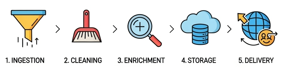 The third stage is enrichment, where additional context is added. The process of integrating geocoding APIs with customer records enables location enrichment while integrating weather data with delivery times enables delay analysis. OpenWeatherMap and GeoNames serve as popular open data APIs used in enrichment pipelines.