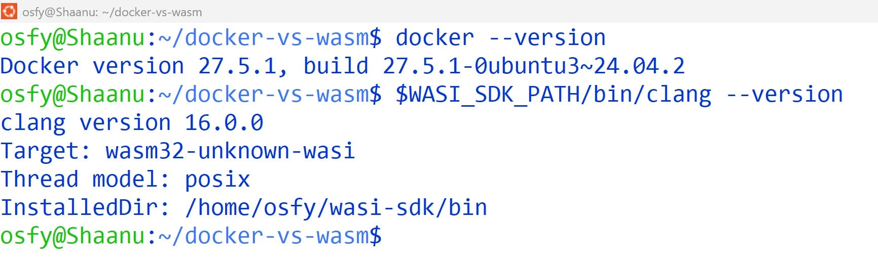 The installation was successfully verified with Docker version 27.5.1 and WASI SDK (Clang) version 16.0.0 on Ubuntu 24.04. as shown in Figure 1.