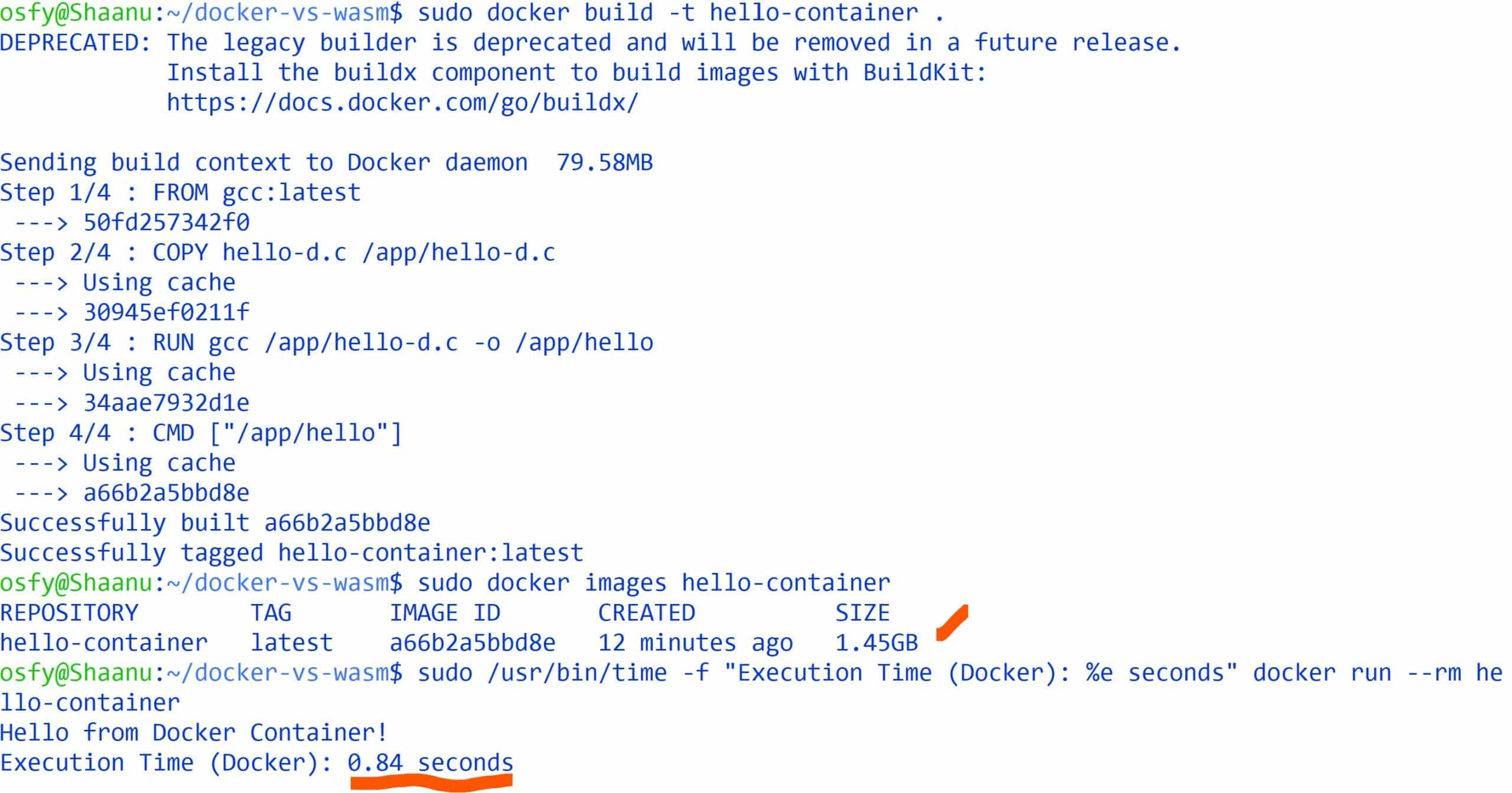 $ sudo docker build -t hello-container . $sudo /usr/bin/time -f “Execution Time (Docker): %e seconds” docker run --rm hello-container