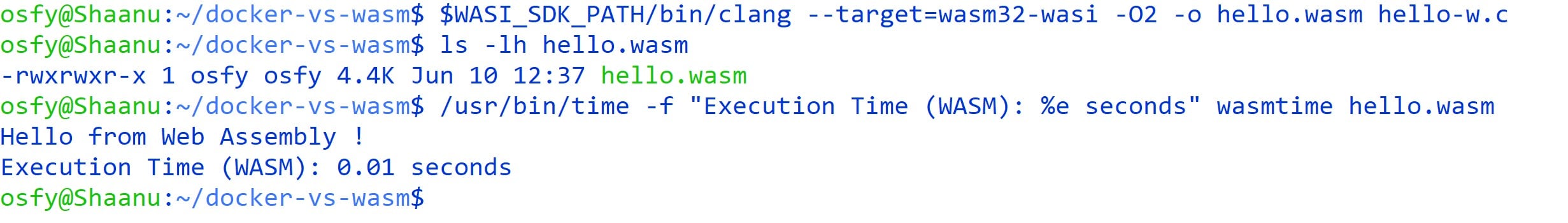 /usr/bin/time -f “Execution Time (WASM): %e seconds” wasmtime hello.wasm