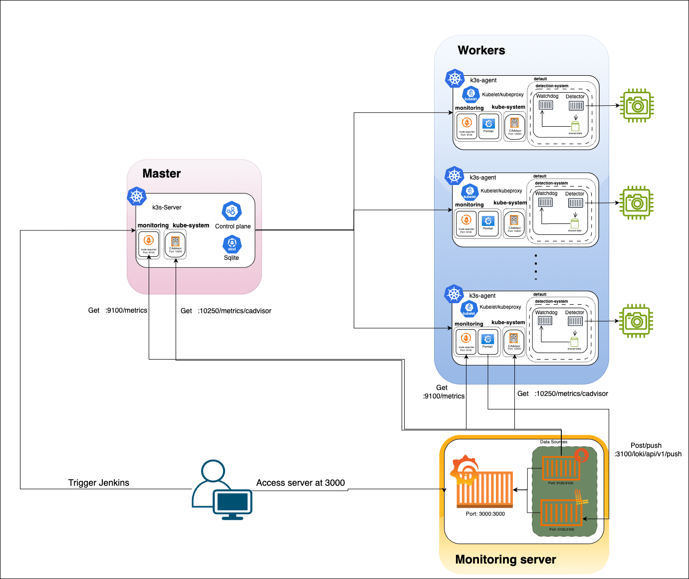 Centralised monitoring is provided by an on-premises observability stack. The local server runs Prometheus, Loki, and Grafana. Each edge node hosts a Prometheus Node Exporter (metrics on port 9100) and cAdvisor (container stats on port 10250). A Promtail agent on each Pi collects system logs and forwards them to the central Loki instance (port 3100). Prometheus scrapes the Node Exporter and cAdvisor endpoints at 15-second intervals, while Grafana (port 3000) provides real-time dashboards of node health (CPU/GPU/memory utilisation), model inference latency, and alert events. This unified stack provides visibility into system performance without relying on external cloud services, aligning with the hybrid cloud-edge design.