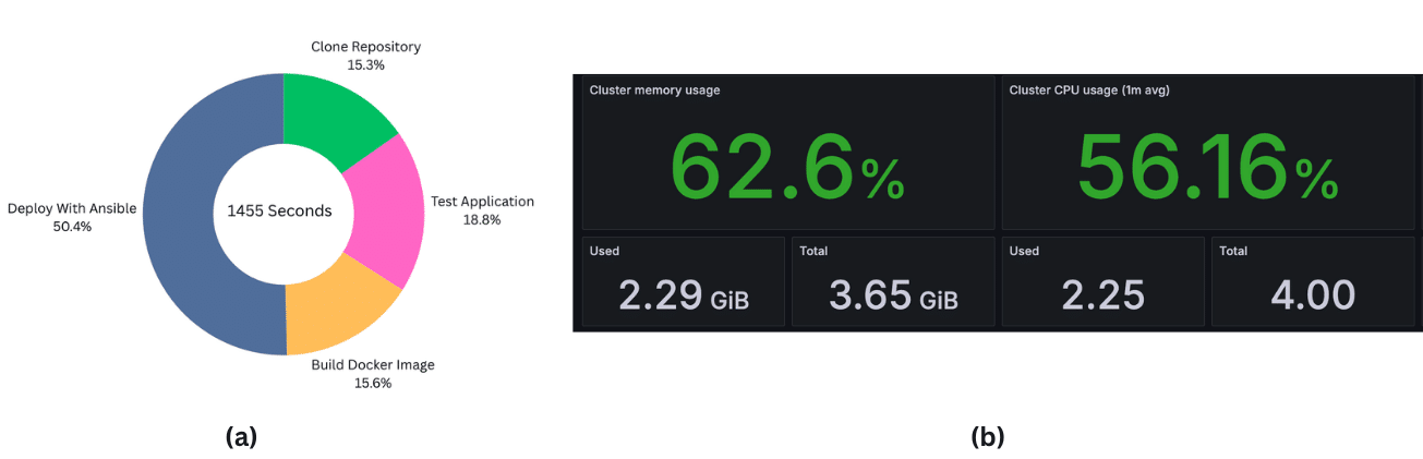 Deployment pipeline efficiency: The Jenkins pipeline completes an end-to-end deployment in an average of 24 minutes 15 seconds for two nodes. The stage-wise breakdown (Figure 3a) is: