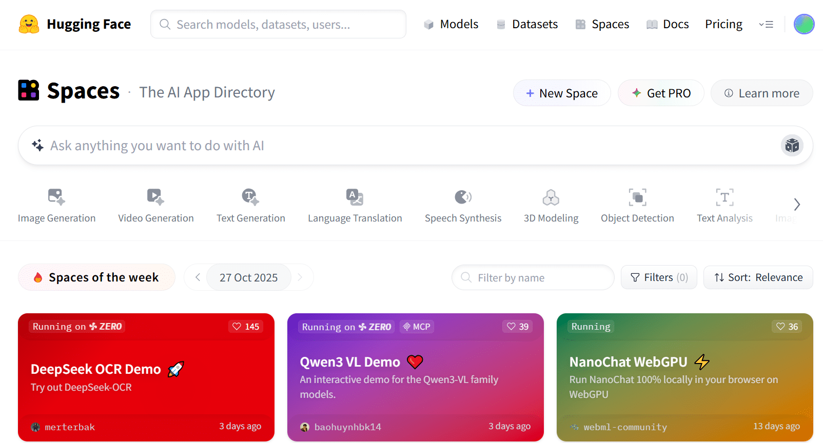 On Hugging Face Spaces, AI-based applications can be deployed for image generation, text generation, video generation, language translation, speech synthesis, object detection, 3D modelling, optical character recognition (OCR), etc.
