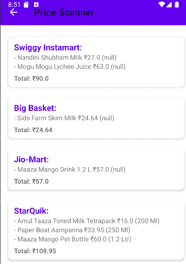 Our goal is to design and implement an Android application that fetches, compares, and displays current grocery prices from various vendors. The application is built to deliver a seamless user experience, supported by a scalable and modular backend. The backend system, developed using FastAPI and Selenium, handles real-time data scraping and exposes this information through RESTful APIs. For development and testing, the API is made accessible to the Android frontend using ngrok tunnelling. The frontend asynchronously retrieves pricing data and presents it through a clean, intuitive interface aligned with modern Android UI standards.