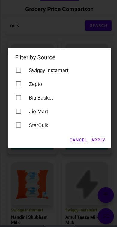 - There are two floating buttons. The first one gives an option to filter out products on the basis of the source (Zepto, Swiggy, etc) as shown in Figure 8.