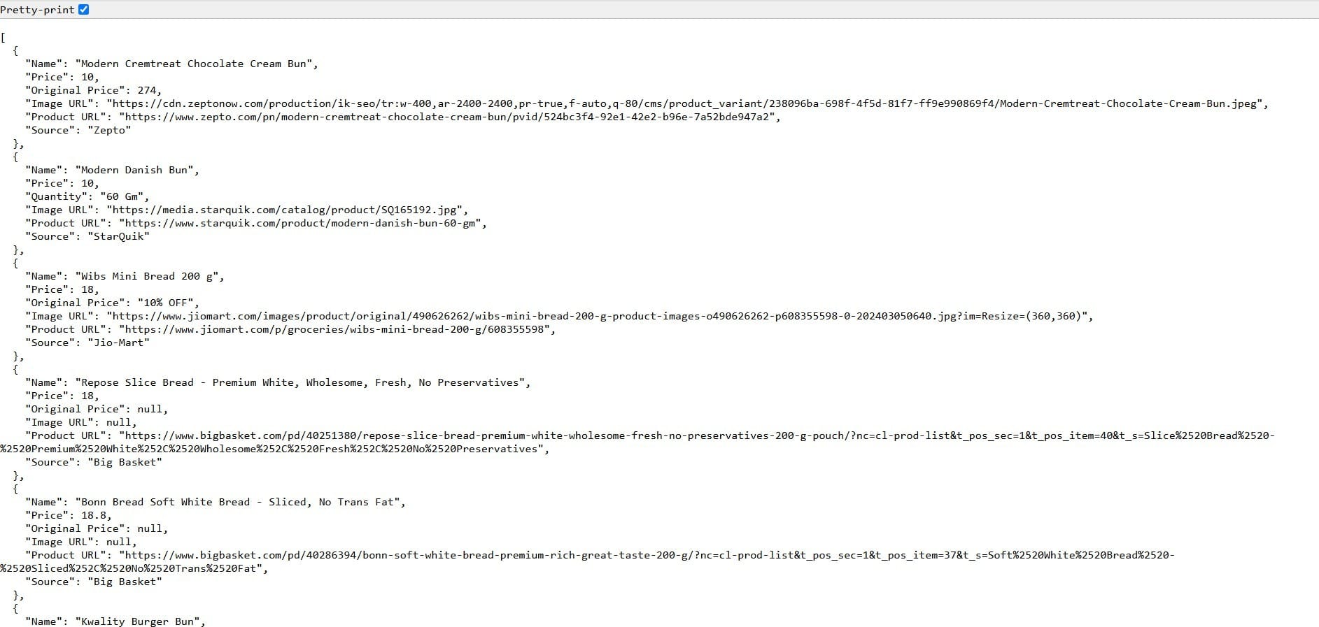 Figure 2 shows a formatted JSON output containing product data scraped from multiple online grocery platforms. Each entry includes the item name, price, store source, image URL, and product link used by the system for real-time price comparison.