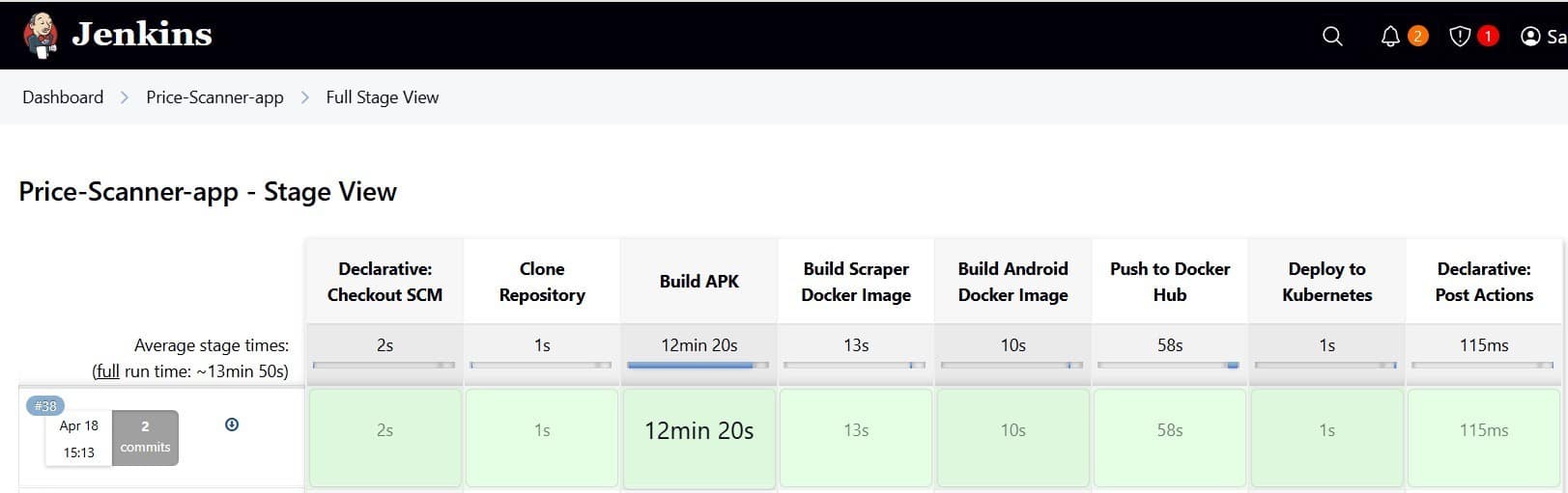 To ensure safe and incremental rollouts, the pipeline was tested with canary deployments and rollback procedures. Figure 4 shows the Jenkins Stage View for the full pipeline. It visually represents each phase from source checkout and APK generation to image building, Docker Hub publishing, and Kubernetes deployment, along with the time taken for each step, offering insight into overall performance and pipeline efficiency.