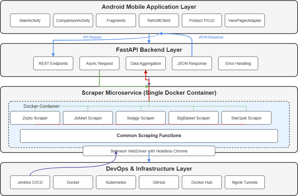 The proposed system follows a modular, microservices-based architecture designed to aggregate grocery pricing data from multiple Indian e-commerce platforms in real-time. It emphasises scalability, low-latency API access, and smooth integration with mobile clients, while also supporting containerised deployment and CI/CD automation for streamlined development and updates. Figure 1 illustrates the high-level architecture.