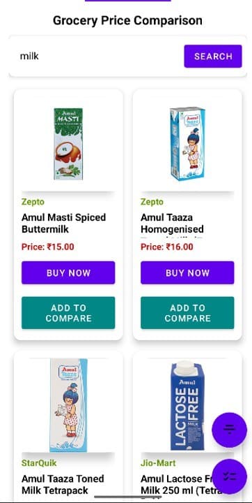 The Android app was tested with live data sourced from the backend via ngrok URLs. Functional tests covered UI rendering, JSON parsing, error handling, and image loading. The app successfully displayed over 100 unique products per store, with no significant lags or crashes. Figure 3 shows the mobile UI of the grocery price comparison app. Upon searching for ‘milk’, the app displays product listings from various online retailers like Zepto, StarQuik, and JioMart, along with prices, images, and actionable buttons for purchase or comparison.