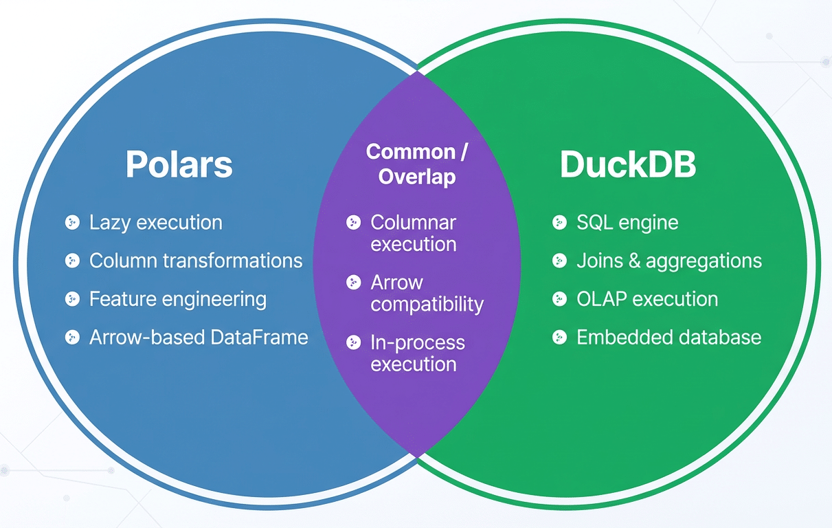 Polars and DuckDB form an excellent in-process analytics stack for 2026. They occupy the important middle ground between traditional DataFrame libraries and fully distributed systems, offering high performance without operational overhead.