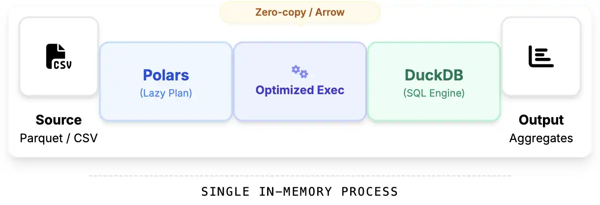 A common architecture uses Polars as the data preparation layer and DuckDB as the analytical query engine. Raw data is ingested and transformed using Polars’ lazy DataFrame API, then exposed to DuckDB for SQL-based analysis. Data exchange typically happens through Arrow-backed memory by registering Polars DataFrames or LazyFrames as DuckDB relations. Execution remains fully in-process, avoiding network overhead or intermediate file writes.