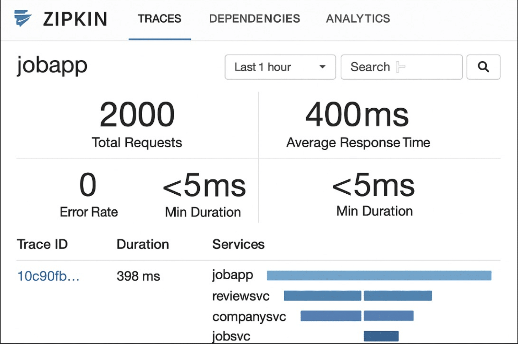 Listing 3: Zipkin configuration spring.zipkin.base-url=http://localhost:9411/ spring.sleuth.sampler.probability=1.0