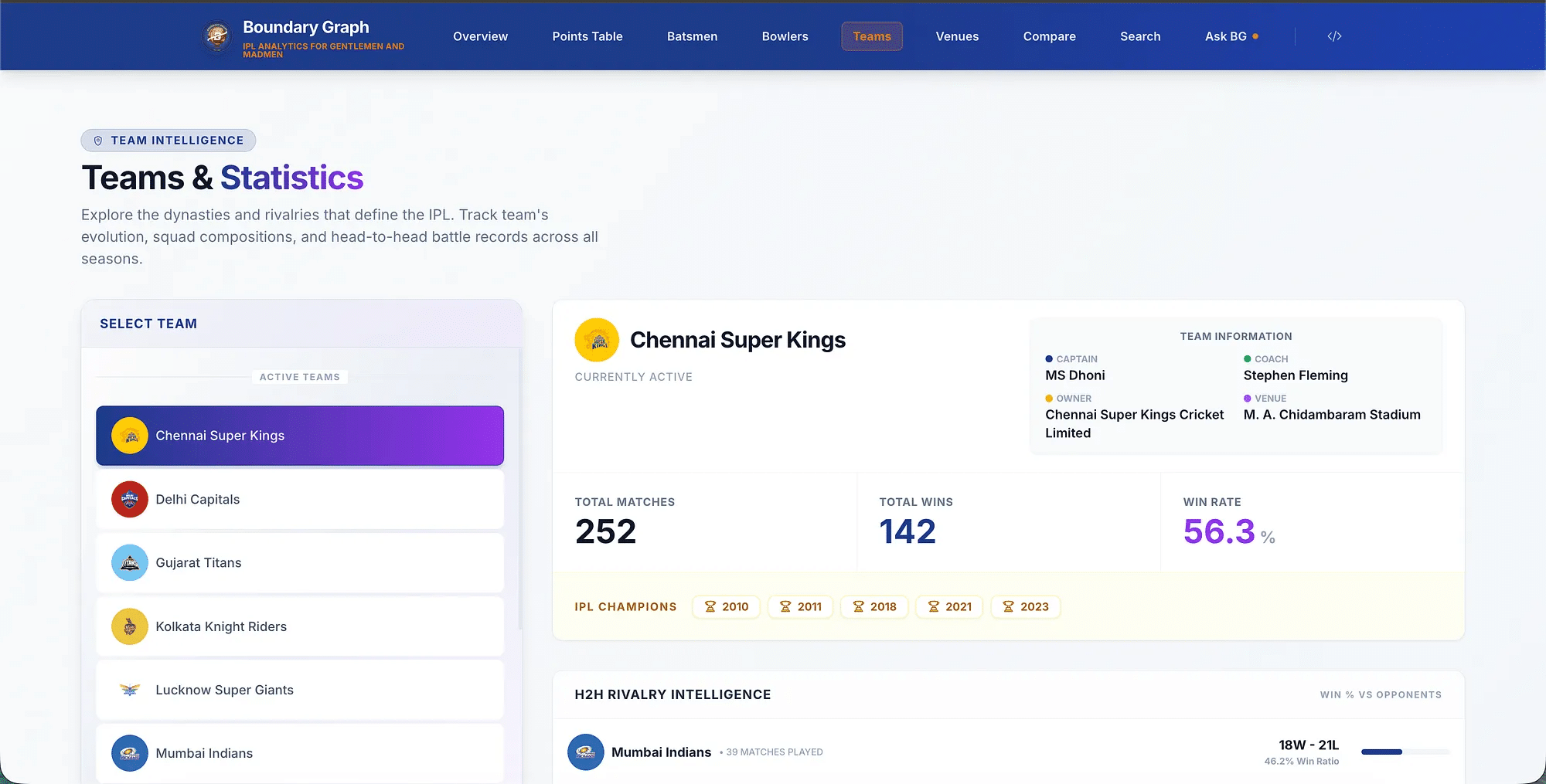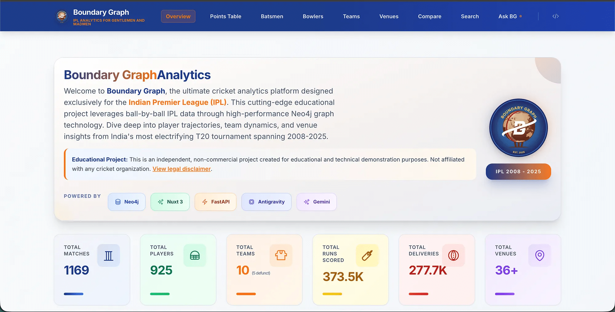 The complete graph model and interactive exploration experience are available through the Boundary Graph application at https://boundary-graph.netlify.app/. The app allows readers to navigate players, teams, venues, and seasons through relationship-driven queries and visualisations, offering a deeper and more intuitive understanding of the IPL beyond tables and aggregates.