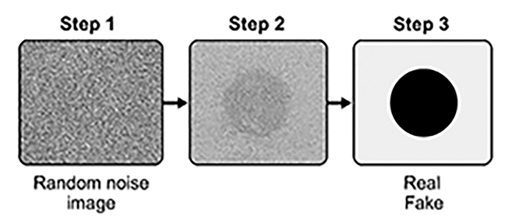 Figure 2 illustrates a diffusion model that generates an image through iterative denoising. Step 1 starts with a random noise image. Steps 2 and 3 are intermediate steps, where the model removes noise and begins to reveal structure (in this toy example, a simple shape).