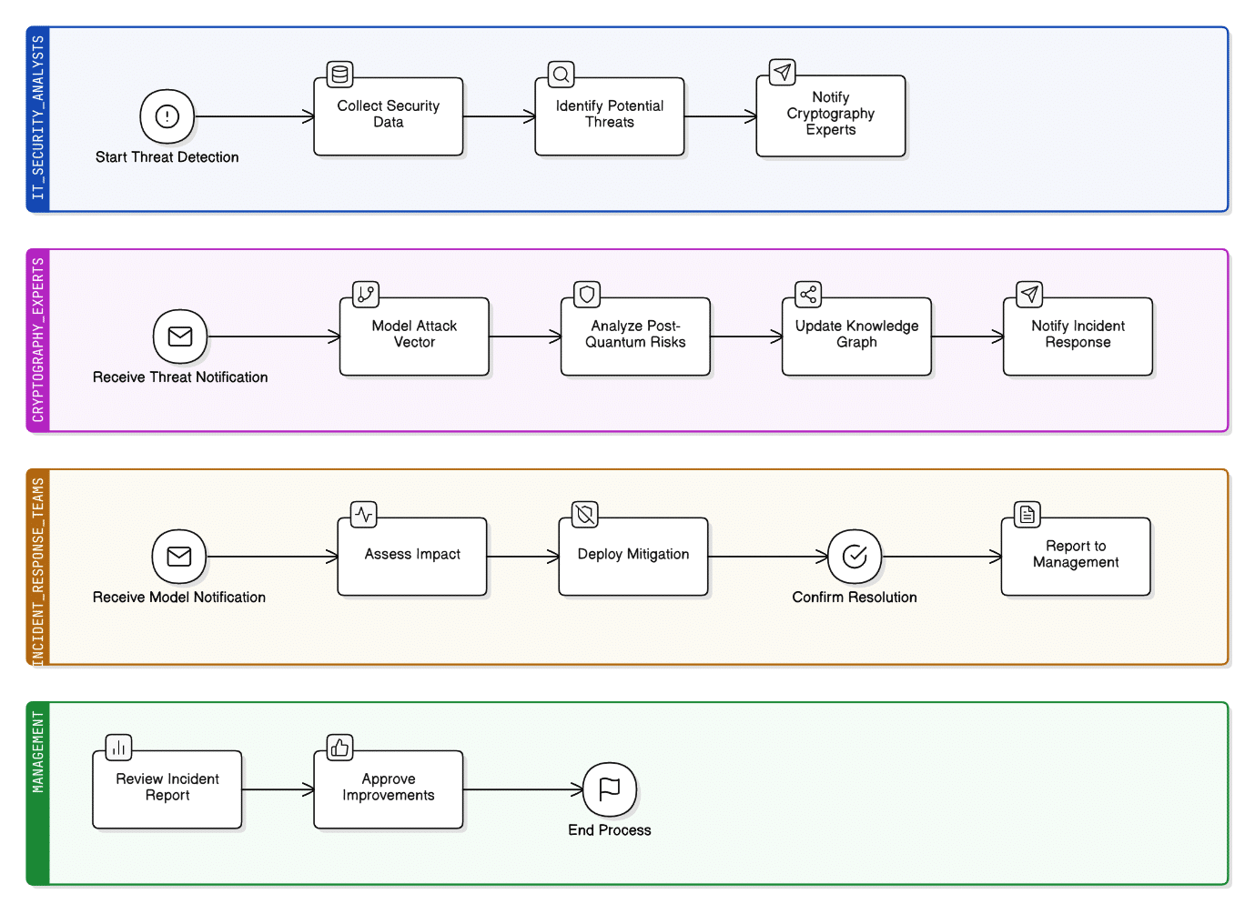 By leveraging knowledge graphs, organisations can simulate potential attack vectors, including those that exploit the unique capabilities of quantum technology. These models help security professionals anticipate how quantum adversaries might target critical assets, exposing gaps that need to be addressed before they can be exploited. The dynamic nature of attack modelling using knowledge graphs supports continuous refinement as new threats emerge and as the organisational landscape evolves. As a result, security teams gain a holistic perspective that enhances their situational awareness, enabling them to respond more effectively to emerging risks. In essence, the adoption of knowledge graph-based methodologies elevates the organisation’s ability to detect threats early, model complex attack scenarios, and reinforce the overall security posture in preparation for the quantum era.
